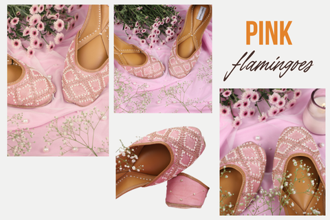 Pink flamingoes are accentuated with golden zardosi, tiny ivory pearl work on a tint of pink raw silk fabric which speaks of elegance.
