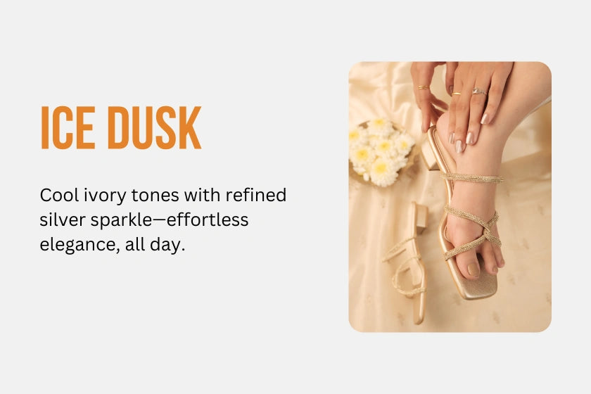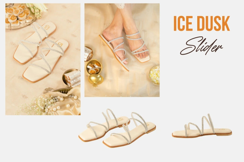 Channel elegance and ease with our Ice Dusk Flats – where cool tones meet refined sparkle. Designed in a serene ivory base with delicately embellished silver straps, these flats bring a breezy sophistication to any outfit. The asymmetrical multi-strap detailing hugs your feet beautifully, making them perfect for both festive glam and modern minimal looks.