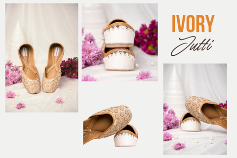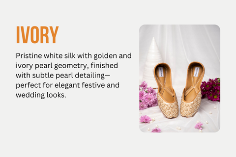 A silk pristine white base, embellished with a combination of golden and ivory pearls in a geometric shape covers the face of the jutti. The back features an inverted triangles border with pearls, which adds minimal subtle looks.