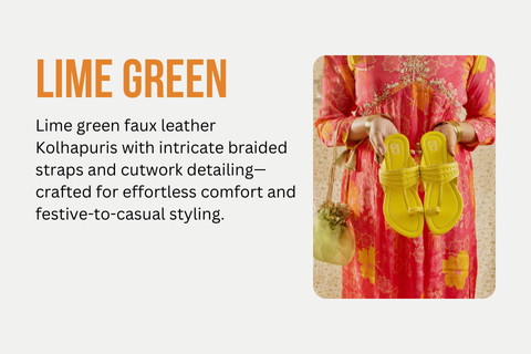 Lime green faux leather Kolhapuris with intricate braided straps and cutwork details. A perfect blend of tradition and comfort for festive and casual wear. Shop now!