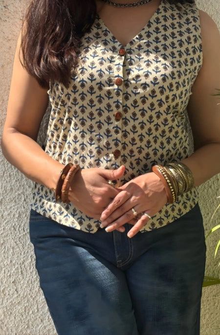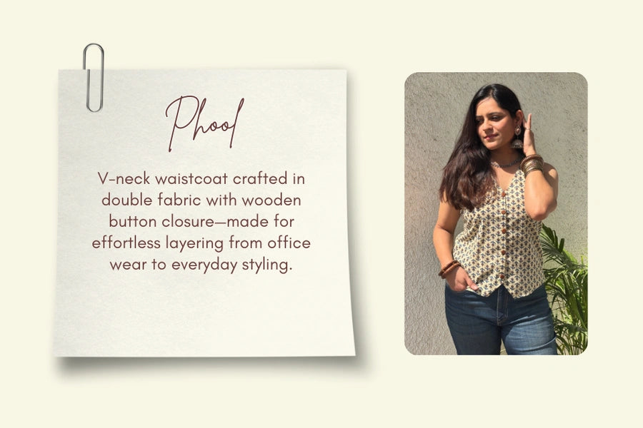 V-neck waistcoat with wooden button closure in double fabric. A stylish layering piece for workwear and everyday outfits.