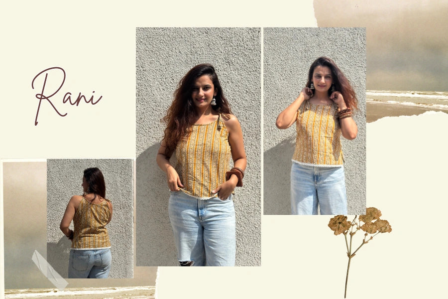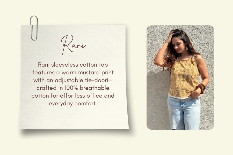 Rani -mustard printed sleeveless cotton top with adjustable tie-doori. Made from 100% breathable cotton for office and everyday wear.