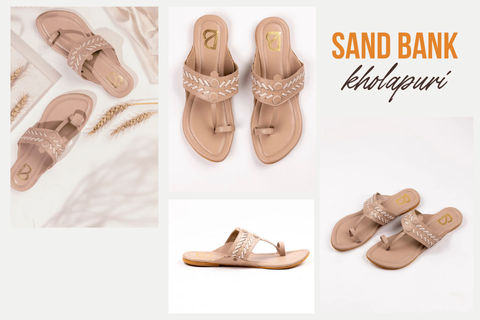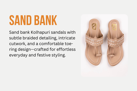 Embrace effortless style with Sand Bank Kolhapuri sandals, featuring a subtle braided pattern, intricate cutwork, and a comfortable toe ring design. Perfect for any occasion!