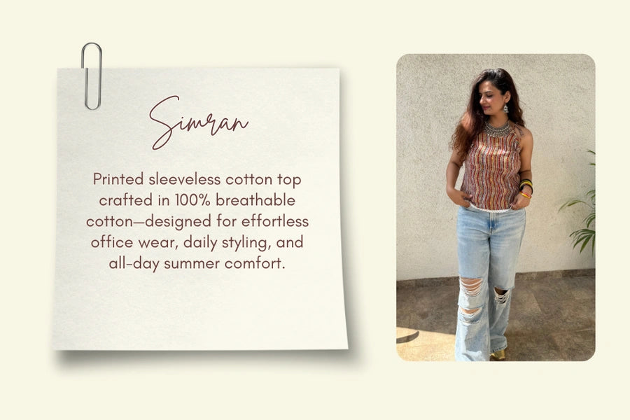 Printed sleeveless cotton top for women made from 100% breathable cotton. Perfect for office wear, daily wear and summer comfort.