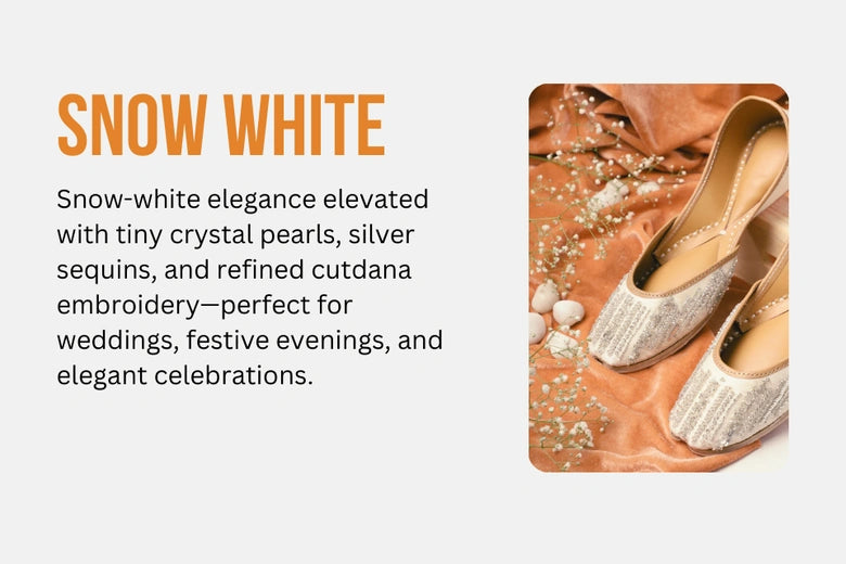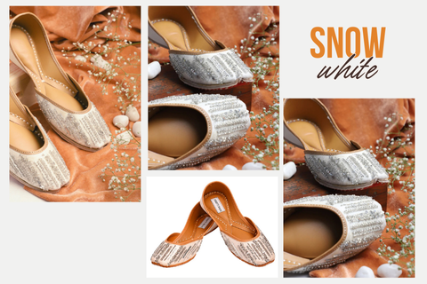 Just the right amount of glamour and Elegance! Snow white jutti embellished with tinny crystal pearls, silver sequins with cutdana along with beautiful embroidery.