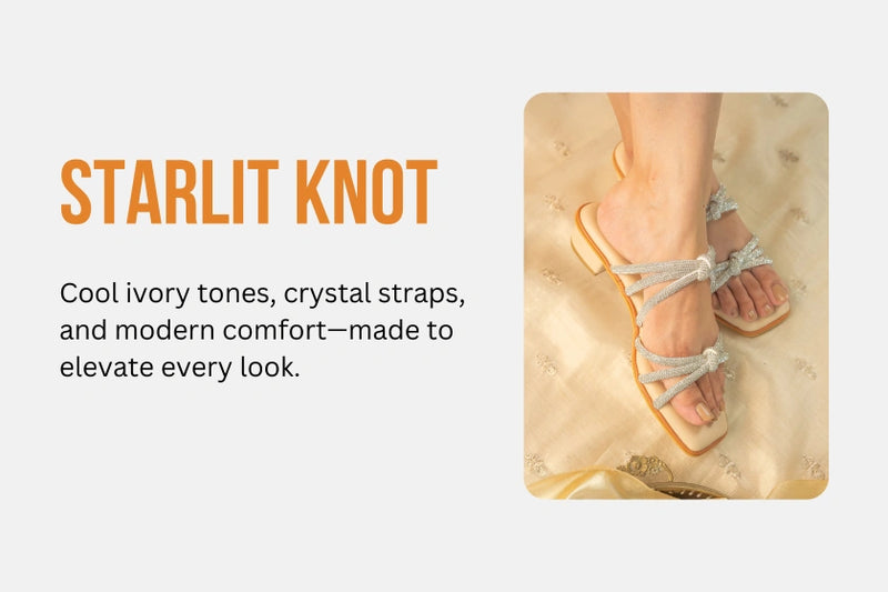 Cool, minimal, and endlessly versatile – our Ice Dusk Flats are crafted for the modern muse. Featuring a sleek ivory base and shimmering silver crystal straps, these flats effortlessly elevate any outfit, from festive Indian wear to chic contemporary looks. The elegant square toe and secure strappy fit ensure both style and comfort for all-day celebrations.